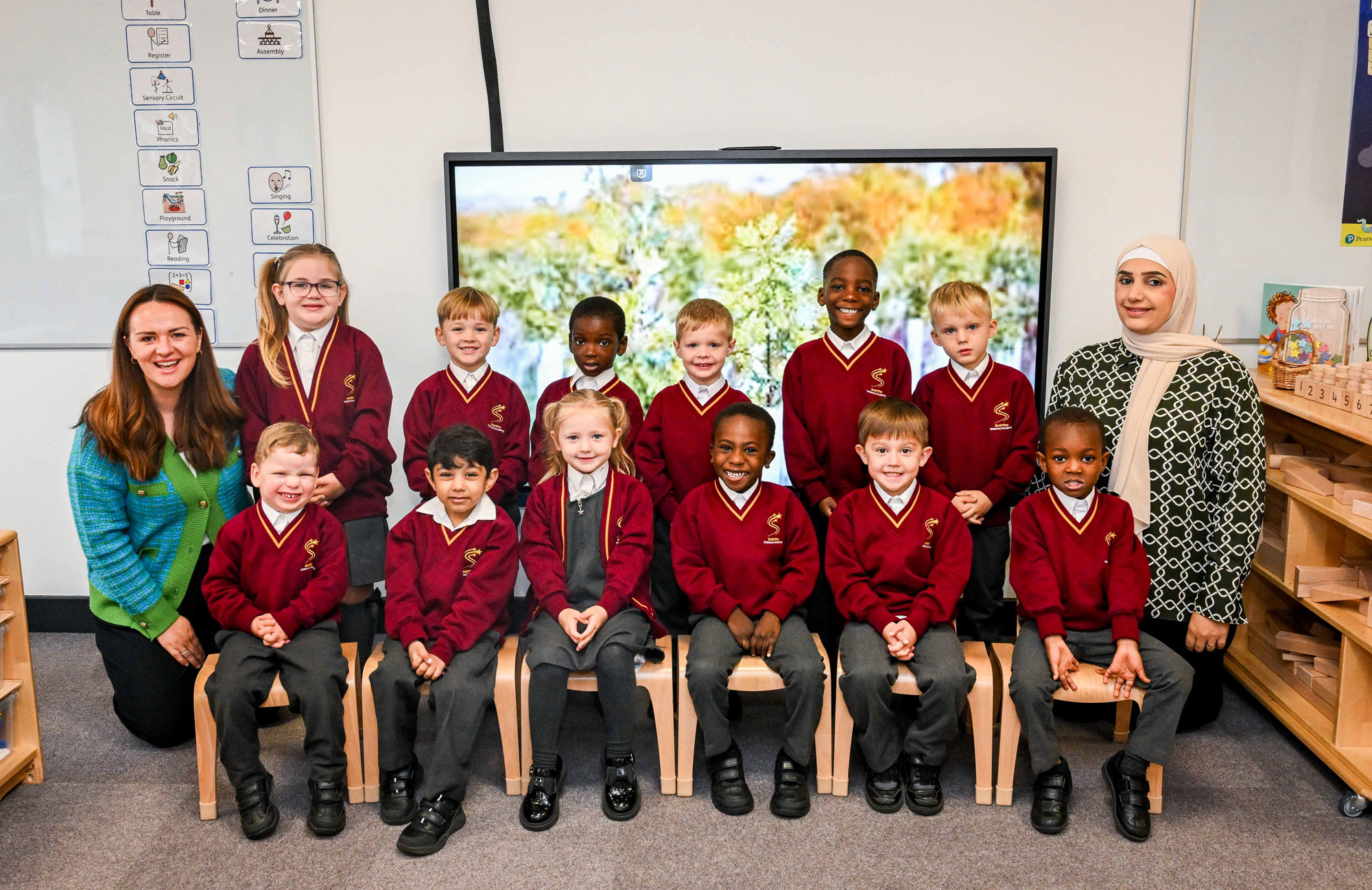 Reception class Saplings with teacher Mrs Berry (left) and teaching assistant Mrs Salameh.